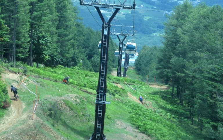 ![]() ロープウェーから見下ろすと、全長4、8kmの狭いシングル上級コースを疾走していた。 |