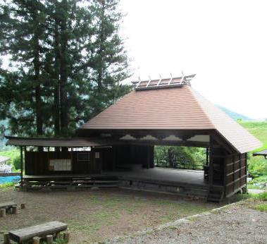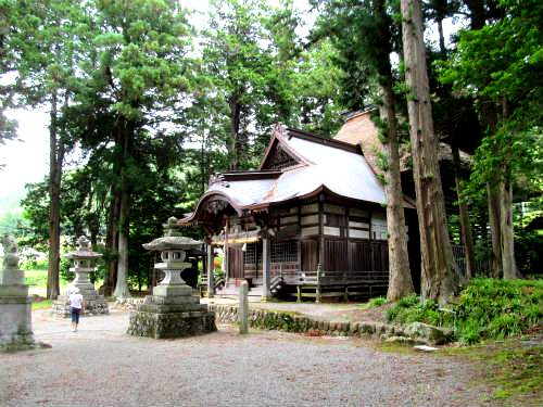『伊那日光』 茅葺に覆われた本殿は規模は小さいが日光の流れをくむ特殊な建築手法と、名工による彫刻で出来上がっている。 両袖障子の福禄寿と寿老人は彫刻師の棟梁が刻んだとされる透かし彫りが目立つ。 |