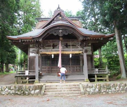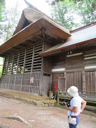 ![]() 拝殿と繋がった茅葺の屋根の中に本殿が痛まない様にあります。 格子で囲われているので、その間から重要文化財を見ることになりました。団体で申し込むと開けてくれるそうです? |