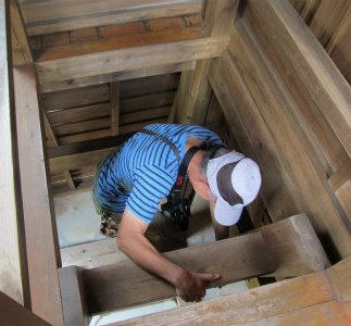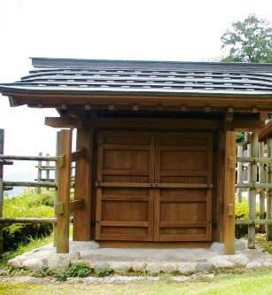 ![]() 物見櫓は垂直なはしごが掛けられている |