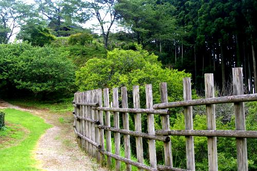 ![]() 空堀の土塁には馬防咲くを張り巡らす。 空堀は水を蓄えず「いばら」等を入れて侵入を防いだと思われる。 |