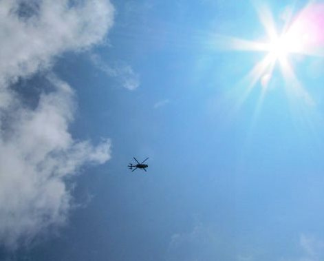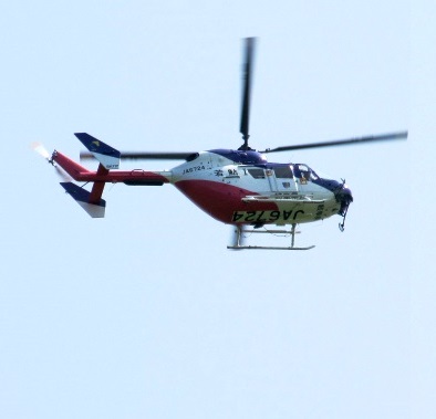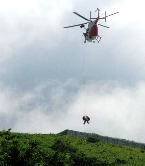 ![]() 山頂で気分の悪くなった女性が倒れていた。 まず救急車が来て担架を持った4人が山頂へ・・・ しばらくして、岐阜県防災ヘリ若鮎T号が飛来してきました。 |
