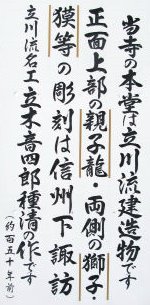 ![]() ![]() ![]() 勝海舟とも面識があった『立川音四郎種清』 幕末から明治の初めにかけて、諏訪の立川流全体をまとめていた大棟梁。 何気なく見てきましたが、帰ってネットで調べたらかなり有名な人でびっくりしました。 |