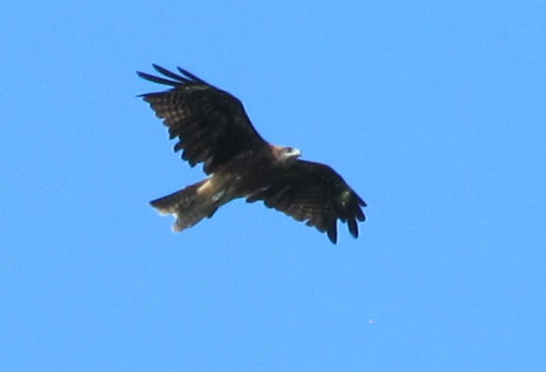ピーヒョロロロ… 本堂の上空鳶(とび)・トンビ ほとんど羽ばたかずに尾羽で巧みに舵をとり、上昇気流に乗って輪を描きながら上空へ 舞い上がる |