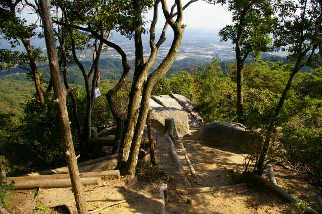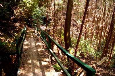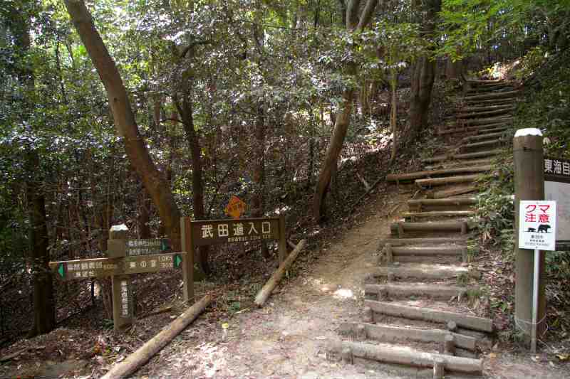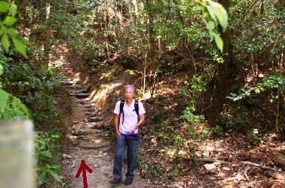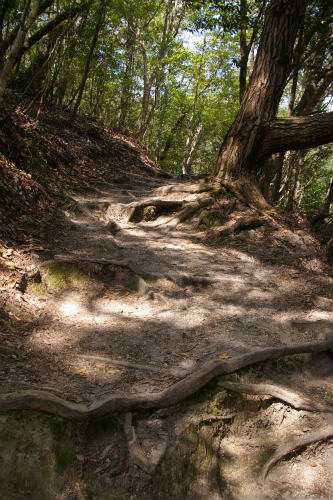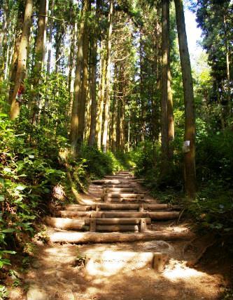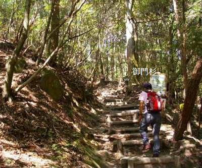 ![]() Pから『御門杉』までの30分は舗装された道で、ここからが登山道です。 いきなりハードな階段が現れた。 |