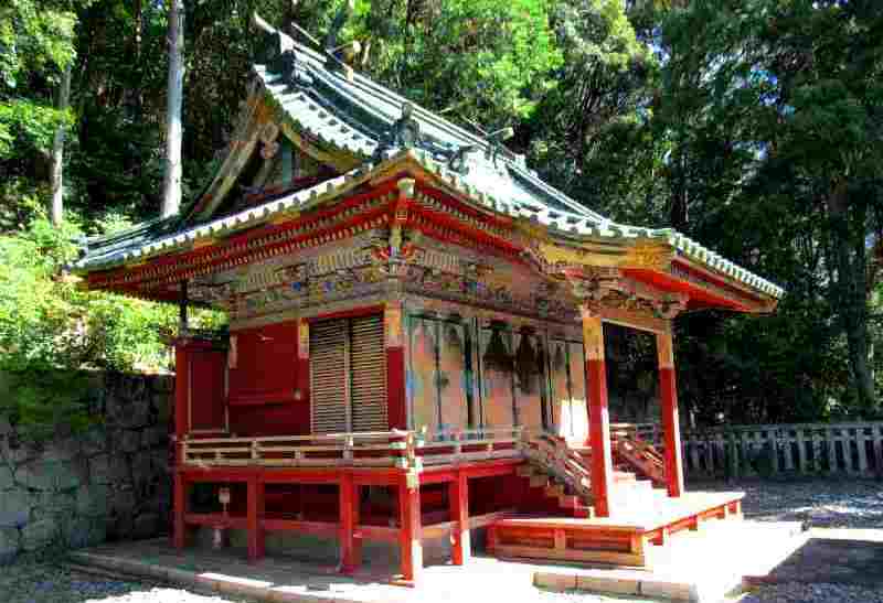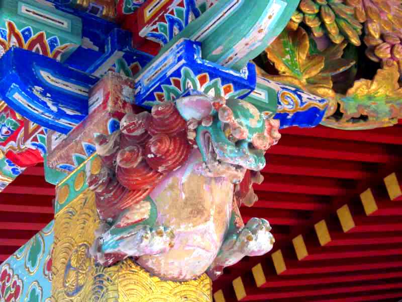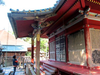 ![]() 社殿は、東照宮風の絢爛豪華な漆塗りおよび極彩色が施され、かえる股、手狭など江戸時代初期の特徴がみられる。 |