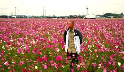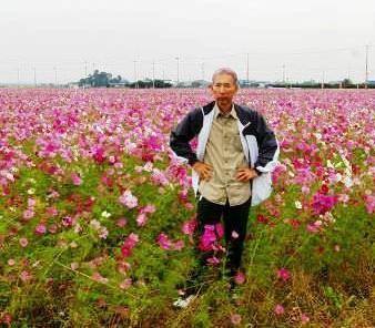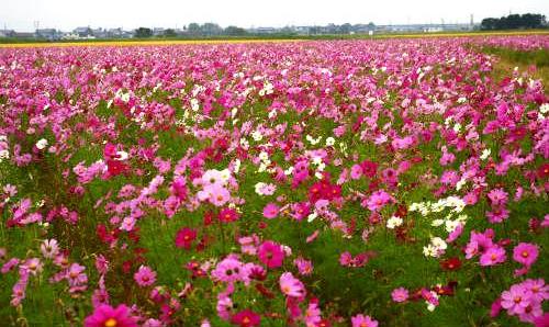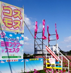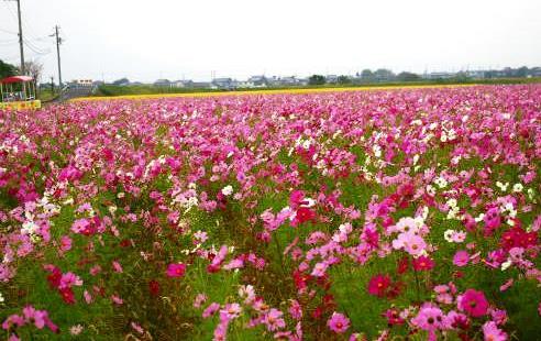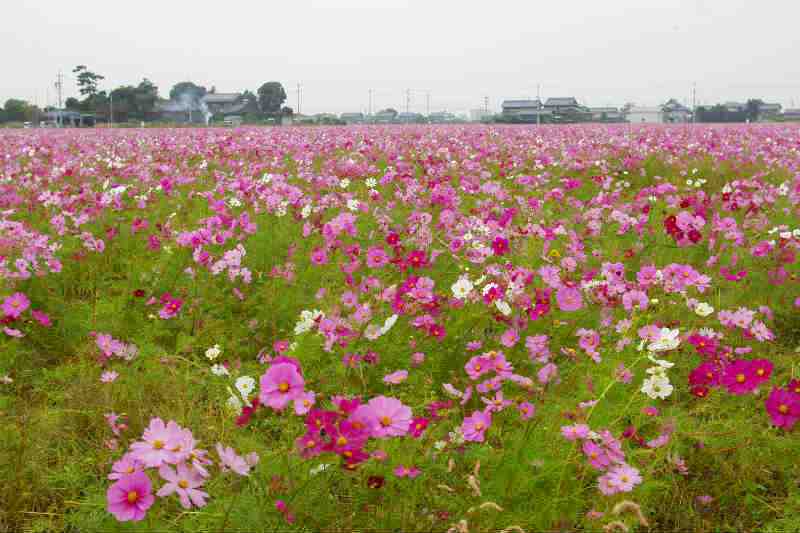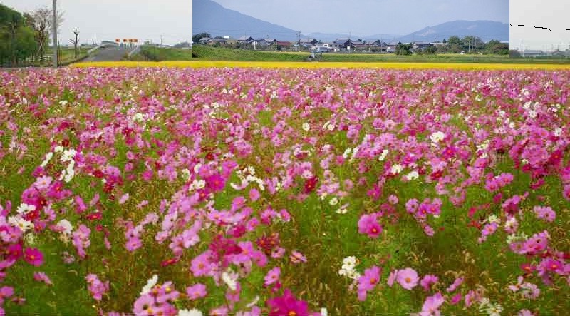![]() 市之枝地区の田園街道沿いの休耕田で、1200万本のコスモスが見ごろを迎えていましたが・・小雨で養老山脈も隠れた。 |
