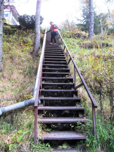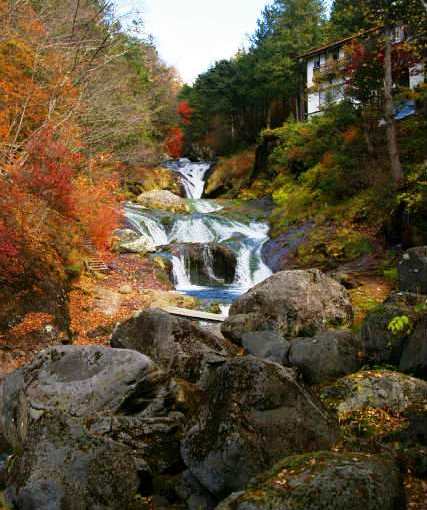 ![]() 100Mほどで滝と旅館が小さく見えてきます |