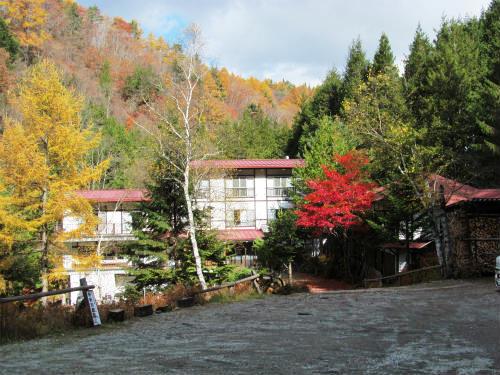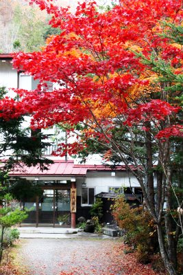 ![]() 奥蓼科温泉郷の一つ『明治温泉』 玄関前のカエデが鮮やか 結構下ったので帰りは車で迎えに来ました |