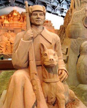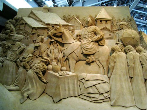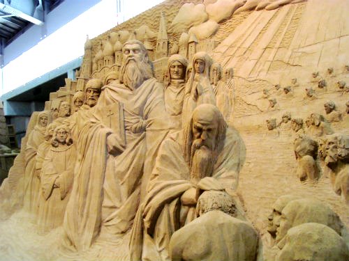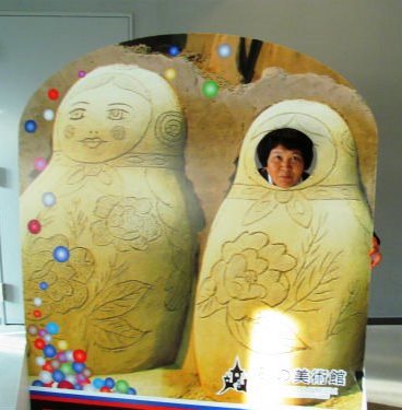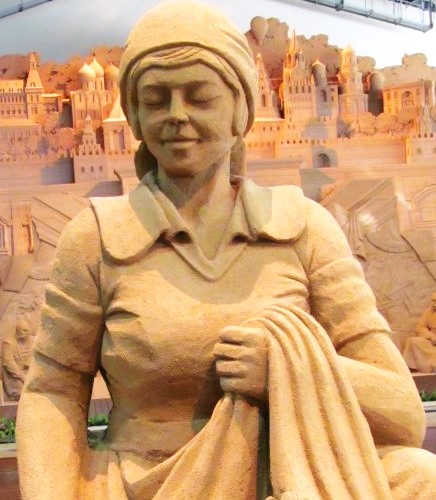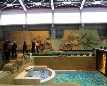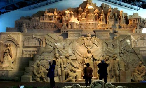 ![]() 砂の芸術は『ロシア』がテーマです 中央はサンクトペテルブルク郊外にある、ロシア帝国時代のバロック様式宮殿 |