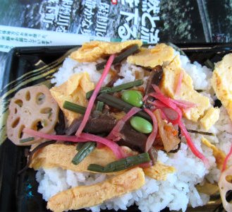 ![]() ![]() 車中での昼飯(黒豆コロッケ・田舎ちらし) |