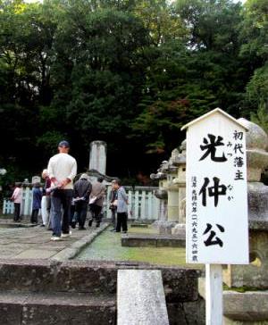 ![]() 墓所内には、初代藩主光仲以後の歴代藩主十一代をはじめ、藩主夫人・御分知家「東館」「西館」当主等も葬られています。 現在、合わせて七十八基の墓碑が立ち並び、周囲には二百六十基をこえる灯籠が家臣等により供えられています。 |