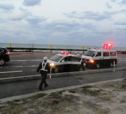 ![]() ド〜ン! 交差点で私たちのツアーバスと軽ワゴンと衝突事故!・・・車内で警察による1時間半の調書が続きぐったり、 トイレがないので、近くの公園までパトカーに乗せられピストン輸送!初めて乗りました。けが人は数名(ケガらしいケガでない)。 |