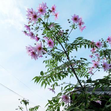 ![]() 皇帝ダリアが街道の祠を見下ろし、道祖神が観光客の安全を見守っていました。 |