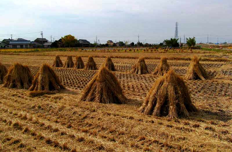 ![]() 『稲わら干し』 先端を縛り三角すいの形にして稲わらを干す |