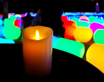 ![]() テーブルに置かれたローソクの火は造りものです(紙に光が当てられているだけですが、出来栄えに感心しました) |