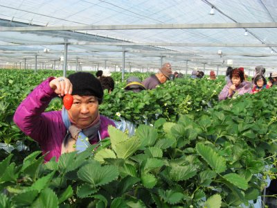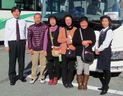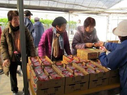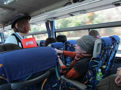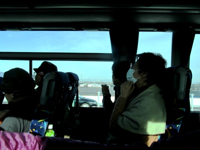 ![]() 手に手にお土産のイチゴを持ってバスに帰還!(ガイドさんと運転手には1箱づつのお土産が貰える?) |