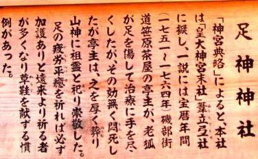 ![]() 『足神さん』 昔、お伊勢参りに訪れた旅人が「帰りも無事に歩けますように」とお願いしたことから、 足にまつわるお願いなら何でも聞いてくれるという「足神さん」とか? |