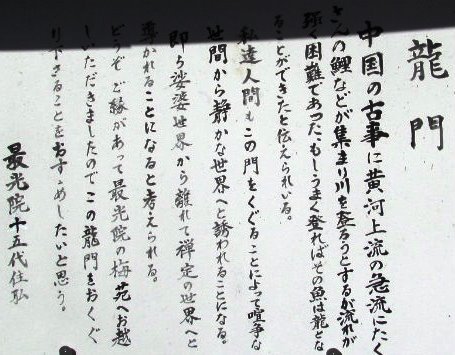 ![]() ![]() 『龍門』 この門をくぐり梅をながめ一時の安らぎを得ることが、幸せの一つですね! |