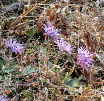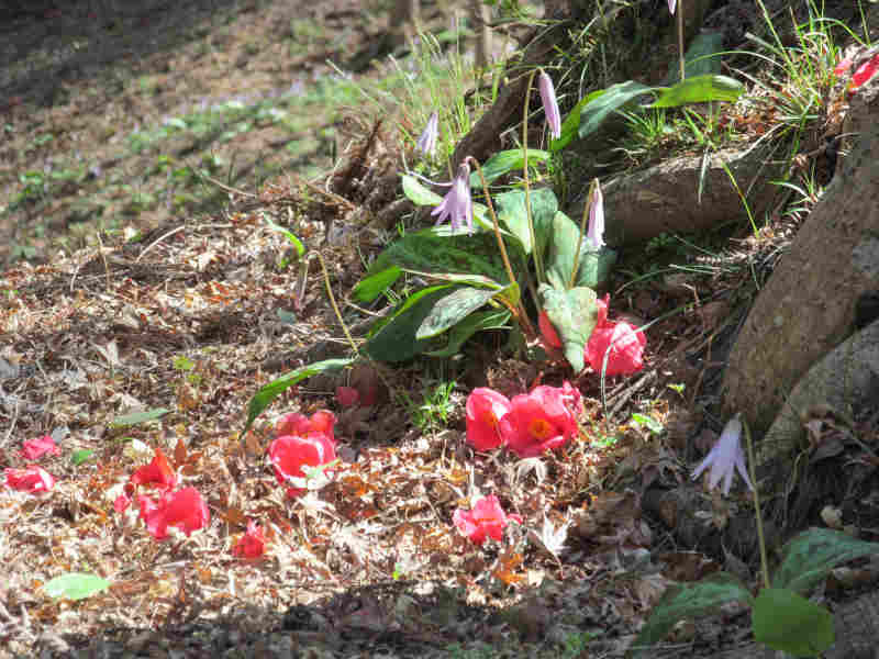 ![]() 紫一色の中に落下した椿が、ひと際目立つ! |