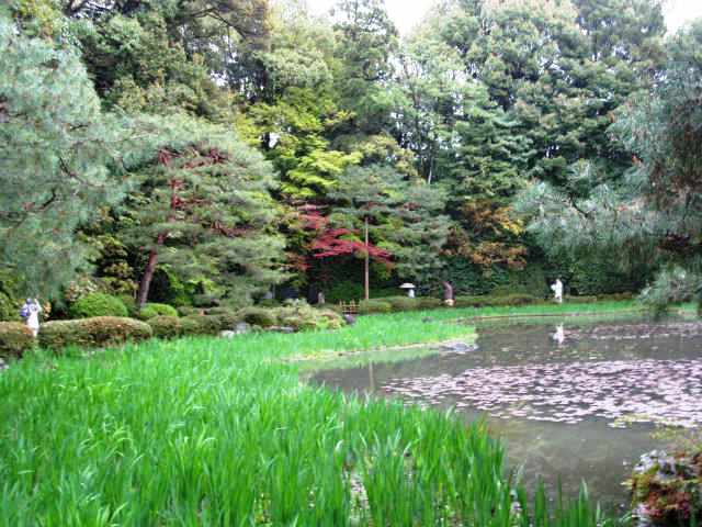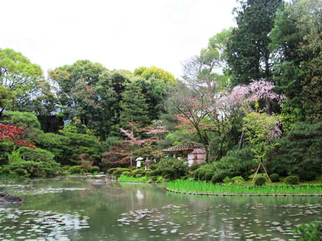 ![]() 西神苑の白虎池は他の神苑の池と比べて浅い。また、水生植物が多数植えられているのが特徴である。 |