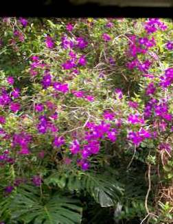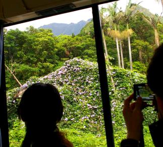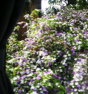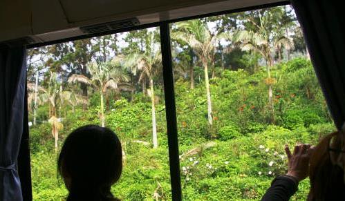 ![]() 車窓からはヤシの木(新しい葉が出ると一枚自然に落ちると?)と、花に覆われた廃屋? |