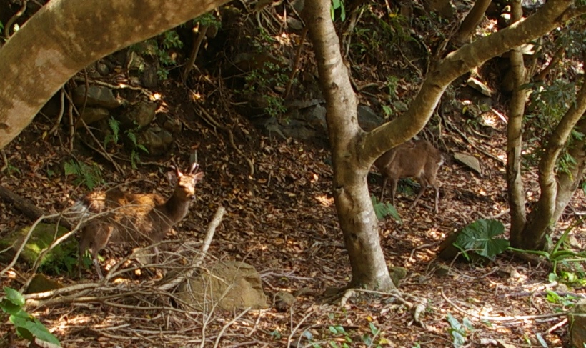 屋久シカが道路脇に二頭 |
