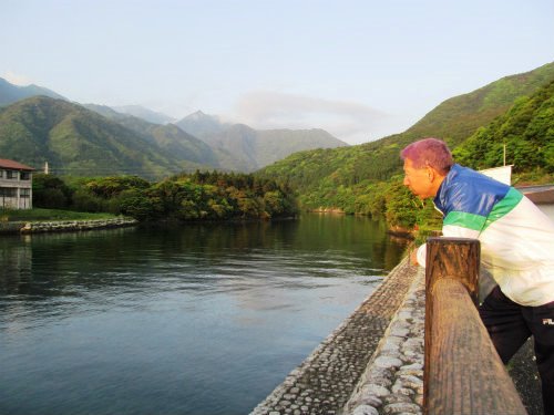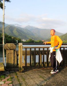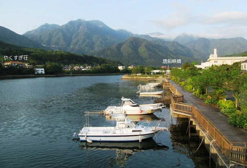 ![]() Am6:00民宿> 宮之浦川に架かる唐船峡橋から朝日を浴びて川岸を散歩 |