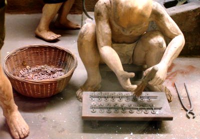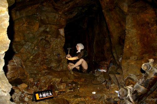 ![]() ![]() 『江戸時代の手掘り』 当時の辛く厳しい鉱石採掘の様子が年代ごとにリアルな人形で再現されています。 |