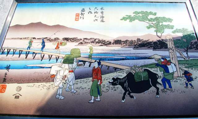 ![]() 69次の65番目が愛知川宿 版画に 『無賃橋』が描かれ、たもとの看板杭に「むちんはし はし銭いらず」の文字が |