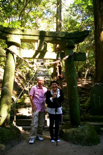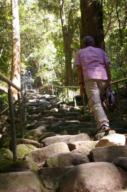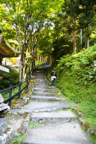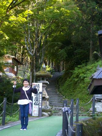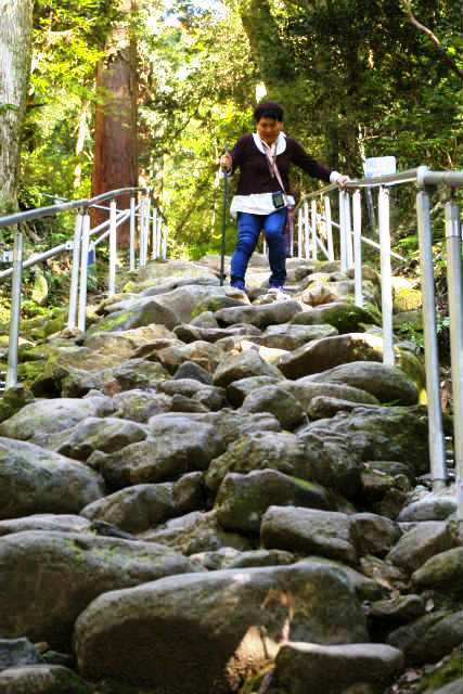 ![]() 鬼が怒っているような険しさの石段を、杖を頼りに下りは慎重に・・・ |