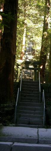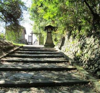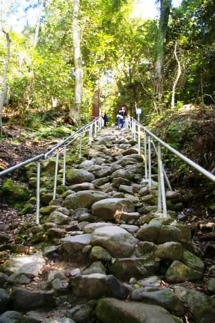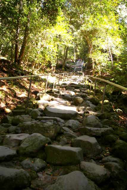 ![]() 人間に騙されて、鬼が一夜で築いたという伝説のある自然石の乱積みの険しい石段を登ると・・・ |