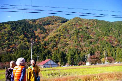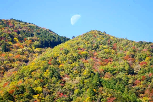 ![]() 振り返れば紅葉の山に下弦の?月が・・・ |