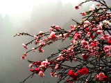 16 しだれ桃 4月14日 3度目でやっと満開の枝垂れ桃が見えたが雨模様! |