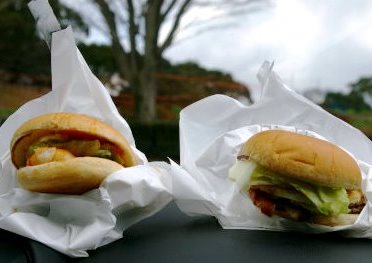 ![]() 『展海峰』の駐車場で佐世保バーガーを食べる。 ベーコンのたっぷり入ったピリ辛! Masamiは海老バーガーをがぶり! |