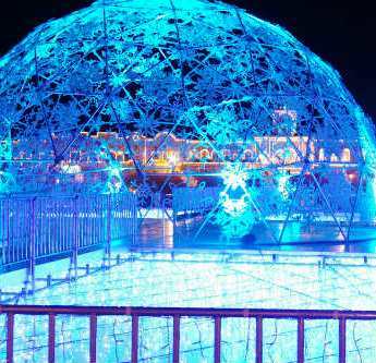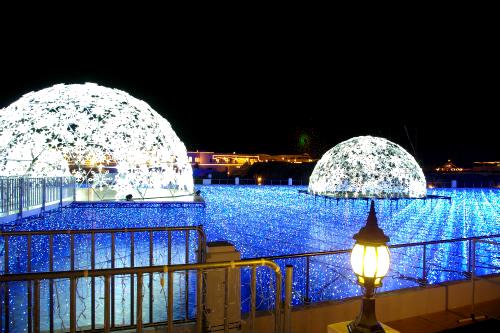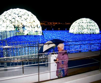 ![]() ![]() 『スノープラネットイルミネーション』 小雨がパラつく中、音楽に合わせテンポよく光るドームが眩しい! |