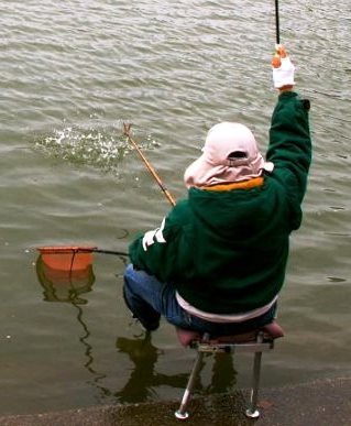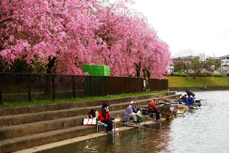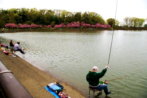 ![]() 丁度大きなヘラブナが釣れた所! 名前の由来は当時「金子山(かねこやま)」と呼ばれ、それから転じたとも言われる。 |