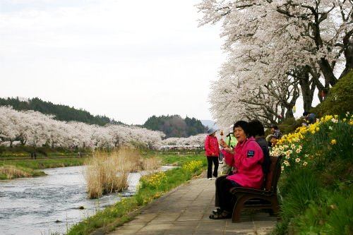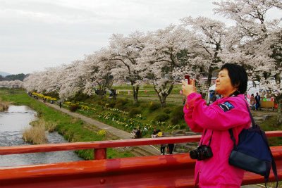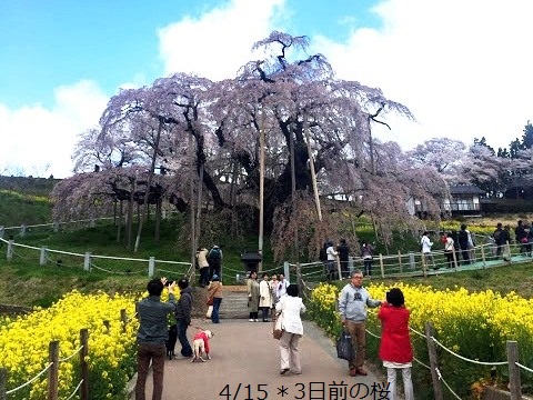 ![]() 前を歩いていた母&娘さんの会話が聞こえた「三春がダメなら千本桜だね!」 すぐさま情報を聞かせてもらいスマホで検索! 私達も磐越道小野町の千本桜に向かう事にした。 |