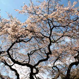 ![]() 四方に伸びた枝に、小さな花を無数に咲かせ、滝のように流れ落ちる「滝桜」。 |