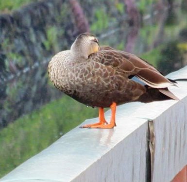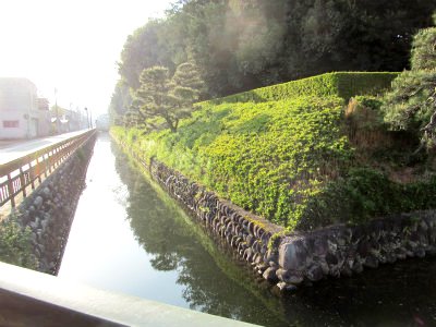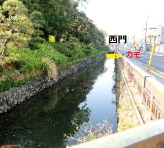 ![]() お堀のフェンスで一休み |