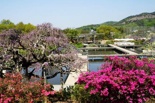 ![]() ![]() 栃木県足利市堀込町に 「早川農園」 として1968年に開園。以来 「250畳の大藤」 として愛されていたが、 都市開発の為 1997年に現在の足利市迫間町 ( はさまちょう ) に移設し、「あしかがフラワーパーク」 としてオープン。 |