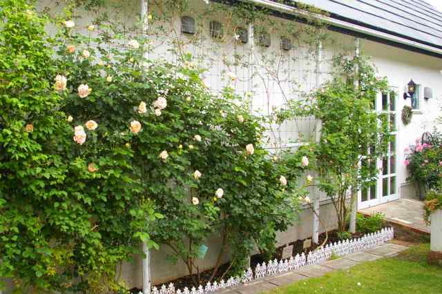 ![]() お洒落なカフェの外観です。 早咲きのバラがちらほら! |