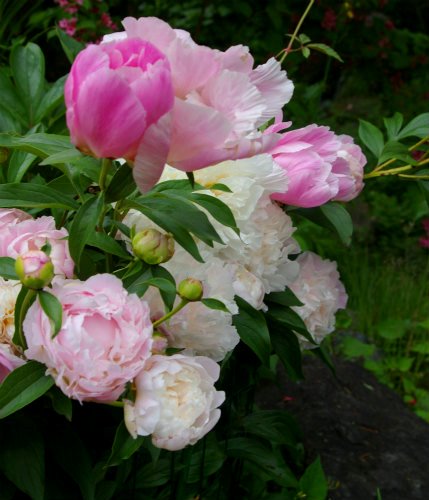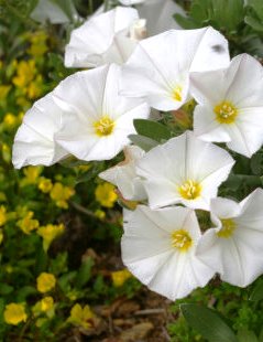 ![]() 中)八重のオダマキ 右)時計草 と、色々な花が咲き乱れる。 |