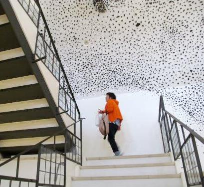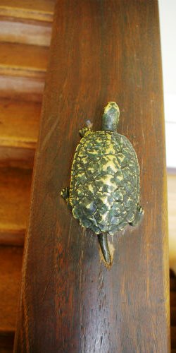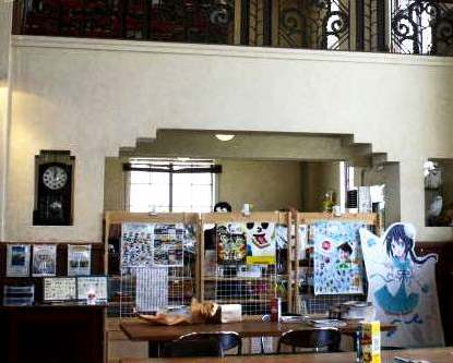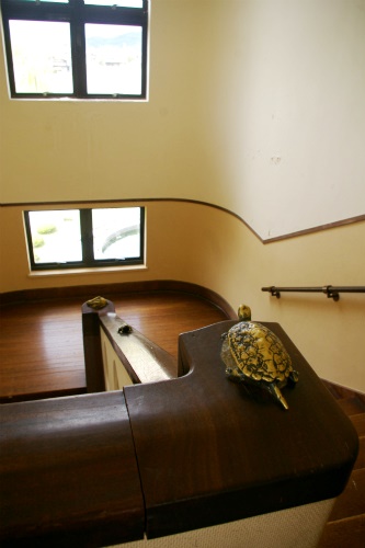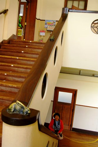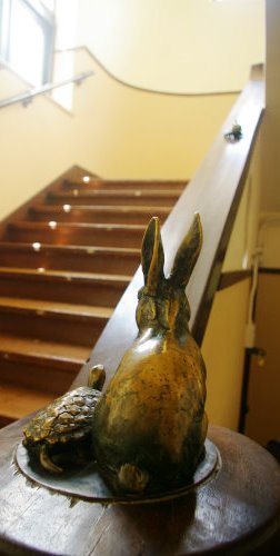 ![]() アニメけいおんでも印象的な階段手すりのうさぎとかめは、1階から3階をステージとした「うさぎとかめ」のイソップ物語を再現しています。 |