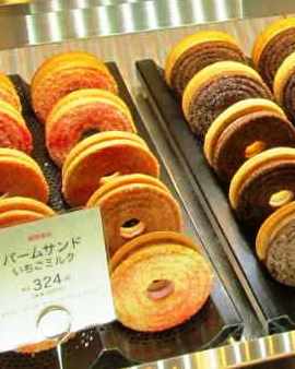 ![]() バームクーヘンを焼いていました。 右)バームクーヘンをかたどったクラブハリエのバームサブレ |