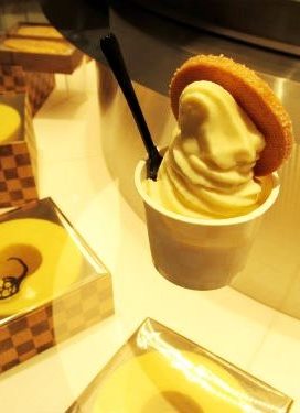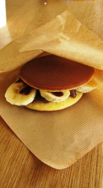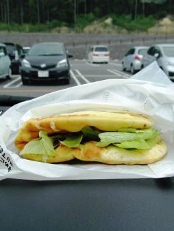 ![]() バナナを挟んだどら焼きとバームサブレとミルキーソフトクリームを買い、外のベンチに腰かけて・・・ |