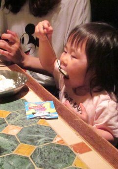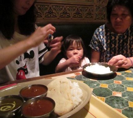 ![]() 提供:ハウス食品なので、全員カレー(ライスとナンが付く)です。 ふりかけを掛けてもらい食べるありす! |