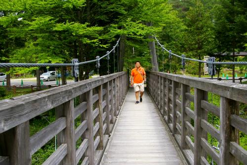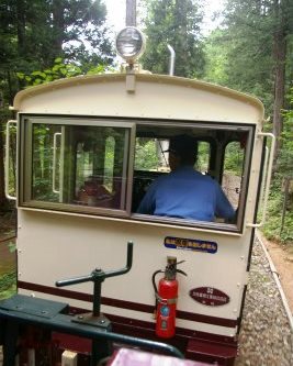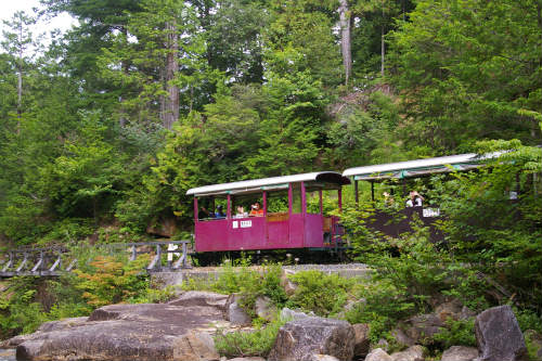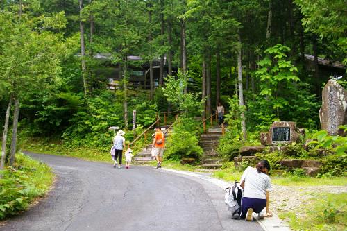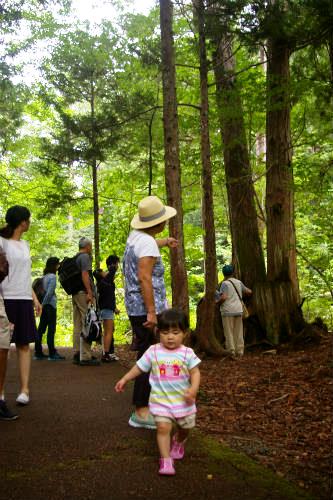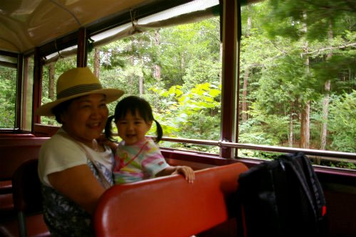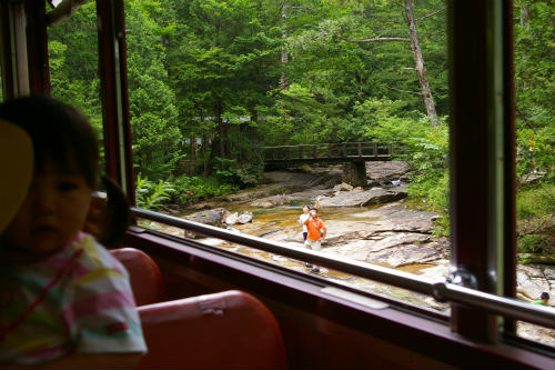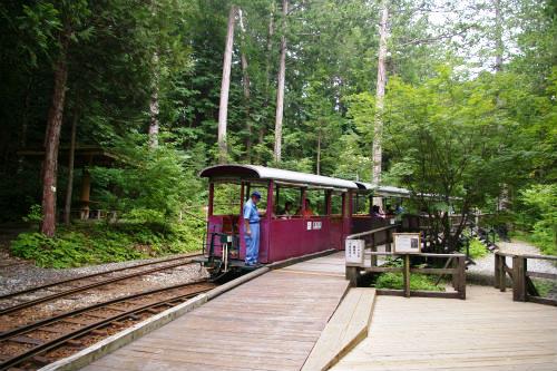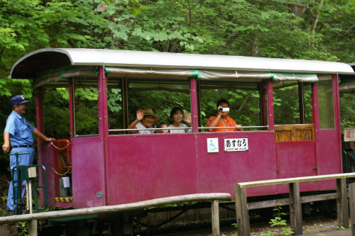 ![]() 車を降りるとヒンヤリと気持ちが良い! 森林鉄道が12:00に発車するアナウンス! ¥1000(JAF-\100)私1人は歩いて写真を撮りに! |