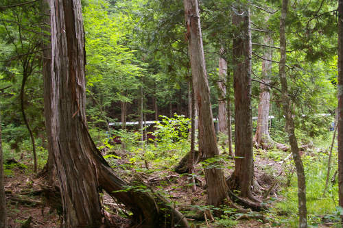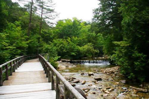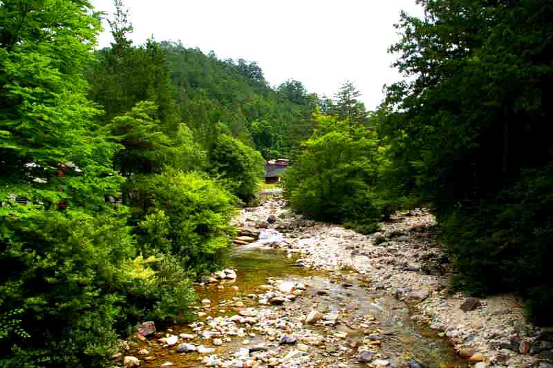 ![]() 山深く分け入りやっと赤沢美林に着きました。 道川どうかわに架かる赤沢端から森林鉄道を眺める |