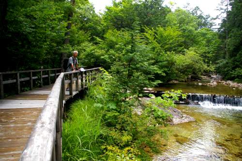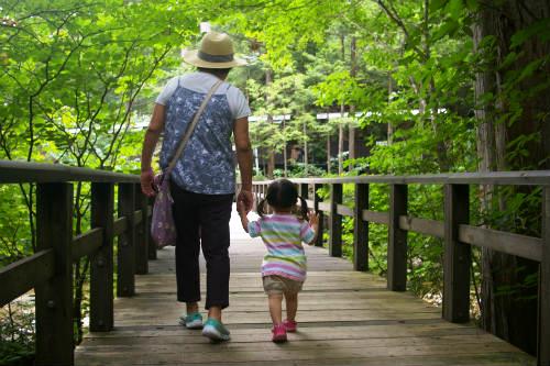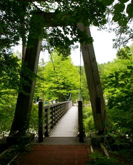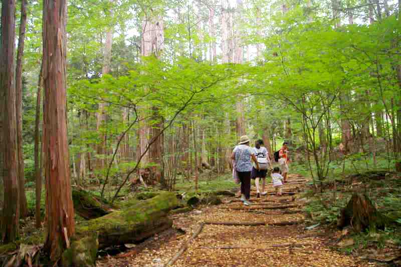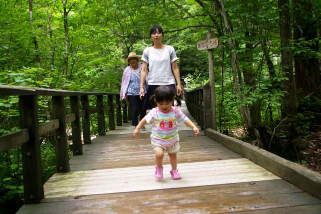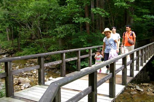 ![]() 森林鉄道と清らかな川・・・そして木曽美林に囲まれたバリアフリーの木道は車いすでもOK! |